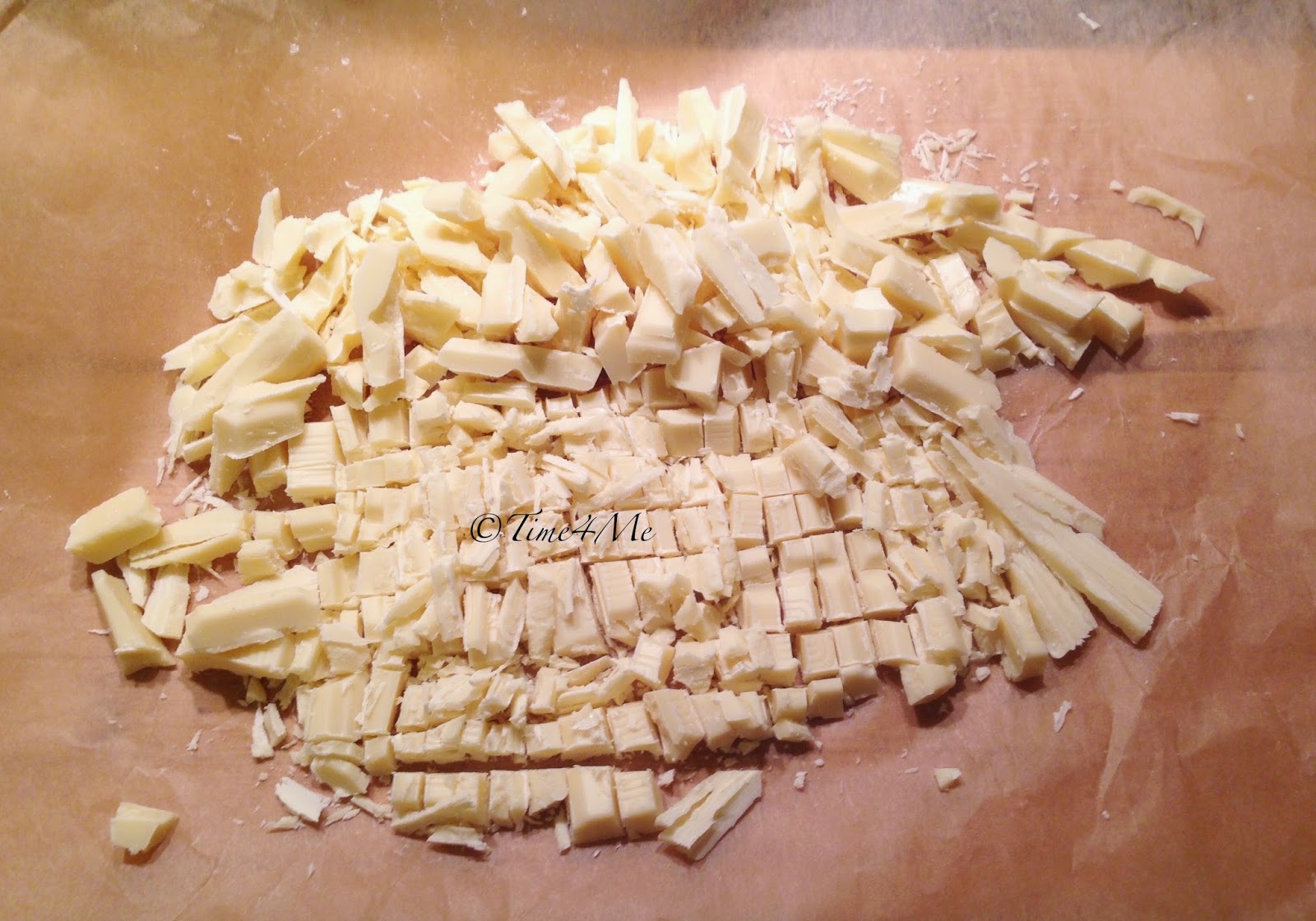 Rastopite maslac (ja ga topim na pari, ali može i u mikrovalnoj) i u njega dodajte nasjeckanu bijelu čokoladu.